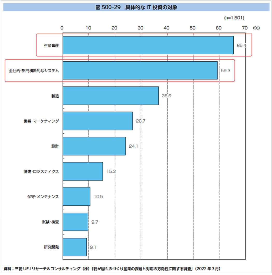 また、製造業におけるIT投資の対象は、生産管理システムが全体の65.4%を占め、投資先の中でも1位となっています。このように現在も製造業の多くの企業で、生産管理システムの導入が進んでいる状況です。