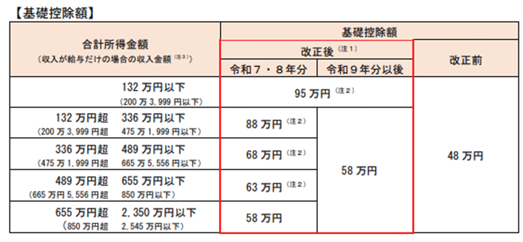 令和7年度の税制改正では、従来48万円だった基礎控除を58万円に引き上げ、その上に段階的な加算措置が設けられました。