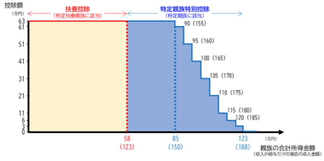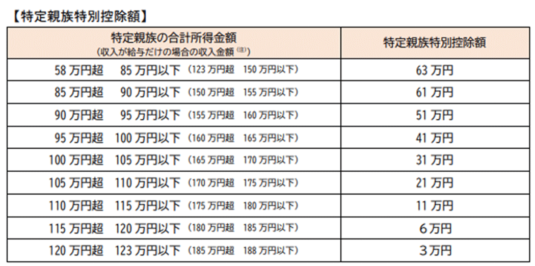 特定親族特別控除は、配偶者特別控除と同様に所得金額に応じて段階的に控除額が減額されるようになります。つまり、特定親族特別控除により、大学生年代の子どもを扶養する家庭は子どもの年収が188万円までなら一定の控除を受けられるようになったということです。
