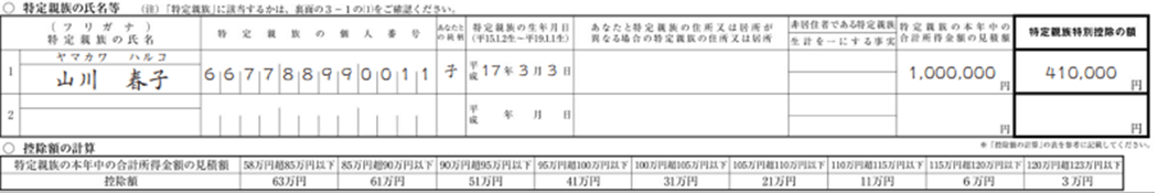 なお、19歳以上23歳未満の扶養親族で、所得金額が58万円超100万円以下(給与収入のみの場合は123万円超165万円以下)の親族は源泉対象扶養親族の「特定親族」として扶養親族の対象となりますが、令和7年扶養控除等(異動)申告書には記載せず、令和8年分扶養控除等(異動)申告書に対象親族の氏名や所得金額等を記載することになります。