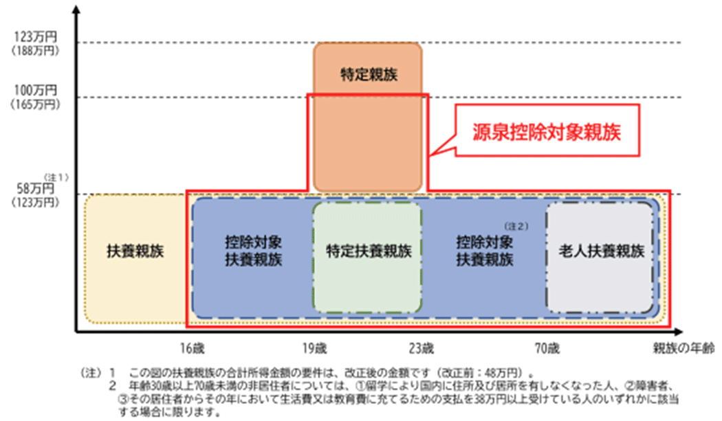令和7年度の税制改正により、扶養親族が19歳以上23歳未満で所得金額が58万円超100万円以下(給与収入のみの場合は123万円超165万円以下)の場合は、源泉対象扶養親族の対象となります。