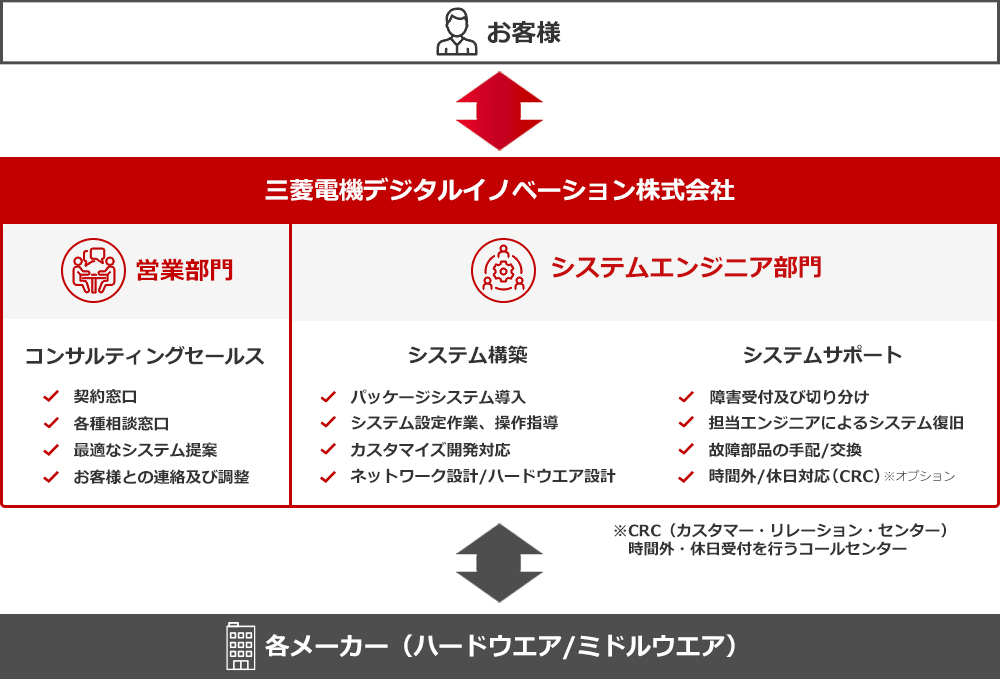 そして、お客様へのサポートは製品・ソリューションご導入後も続きます。安心してご利用いただけるために、お客様のさらなる成長を支えるために。お客様の身近な相談役、それが私たち三菱電機デジタルイノベーションのサポート&サービスです。
